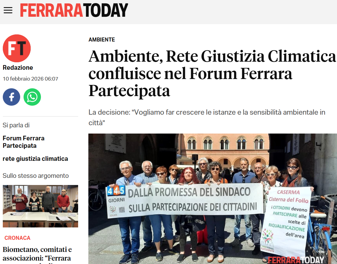 “La crisi climatica si sta aggravando. Speriamo che questa scelta ci porti a essere più incisivi nel portare dei cambiamenti a livello locale, perché uniti si è più forti”. Con queste parole Francesca Cigala del Forum Ferrara Partecipata ha annunciato lunedì 9 febbraio la confluenza di Rete giustizia climatica all’interno del Forum, una scelta maturata anche in conseguenza della pluriennale attività della Rete, nata nel 2020, e della partecipazione attiva alle tematiche ambientali della città, come dimostra la promozione di tre petizioni sui temi della creazione di spazi verdi, della mobilità sostenibile e la trasparenza sugli interventi ambientali.