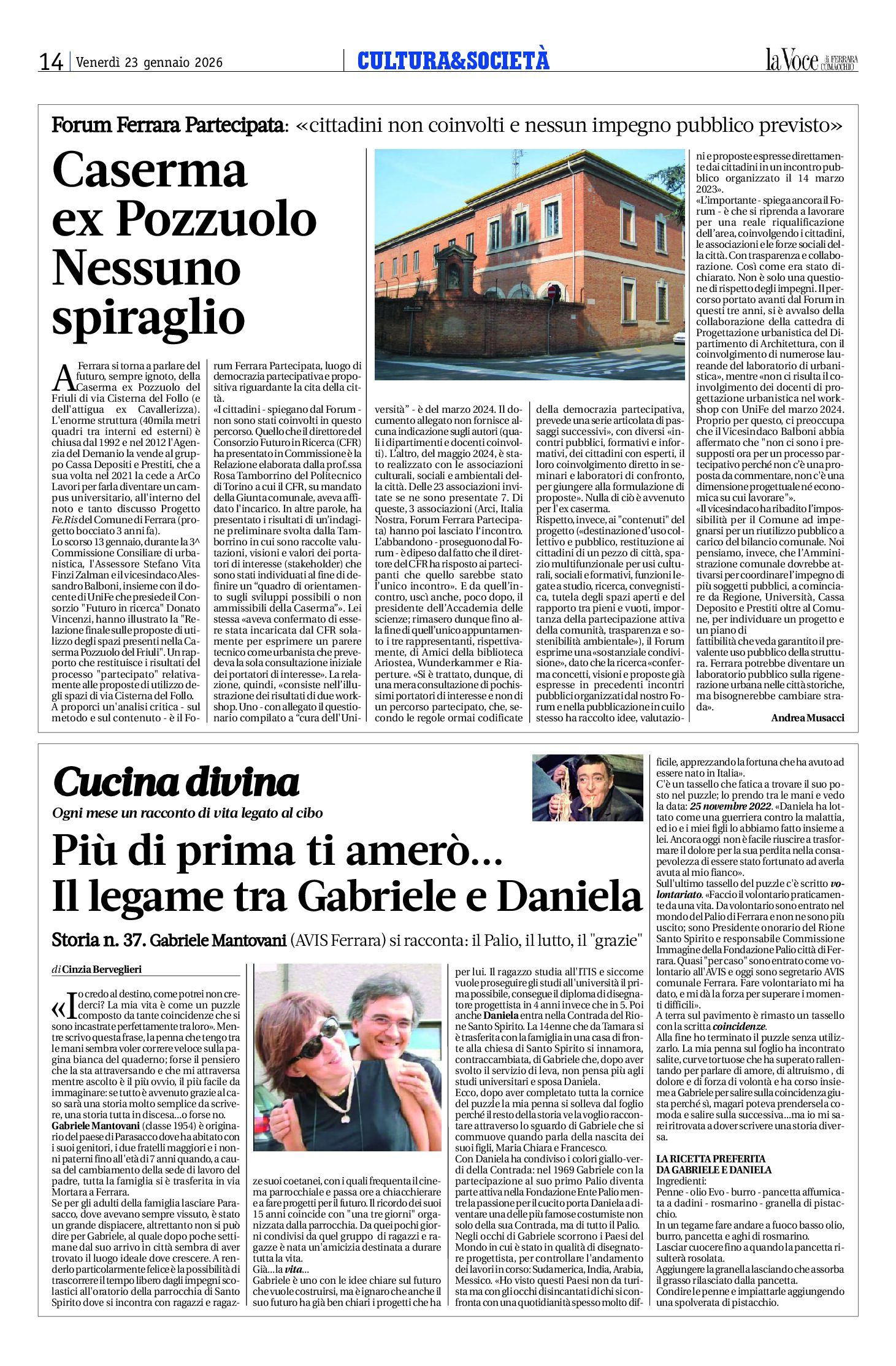 Lo scorso 13 gennaio, durante la 3 Commissione Consiliare di urbanistica, l’Assessore Stefano Vita Finzi Zalman e il vicesindaco Alessandro Balboni, insieme con il docente di UniFe che presiede il Consorzio “Futuro in ricerca” Donato Vincenzi, hanno illustrato la “Relazione finale sulle proposte di utilizzo degli spazi presenti nella Caserma Pozzuolo del Friuli”. Un rapporto che restituisce i risultati del processo “partecipato” relativamente alle proposte di utilizzo degli spazi di via Cisterna del Follo.