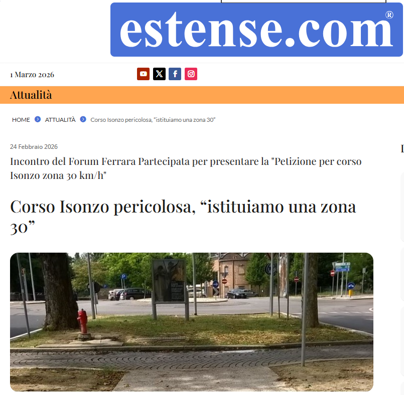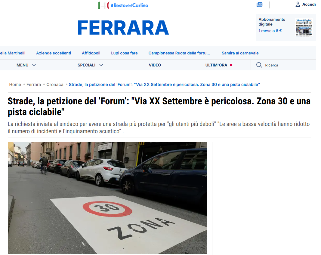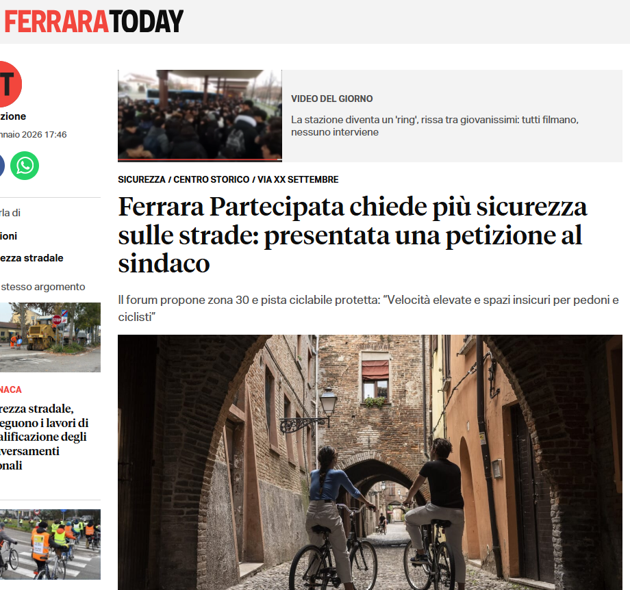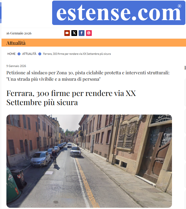 na petizione per chiedere l’istituzione di una ’Zona 30’ e la realizzazione di un percorso ciclabile in via XX Settembre, “sicuro e delimitato, lungo tutta la strada, insieme ad interventi strutturali per la sicurezza e la vivibilità urbana”. A presentarlo è il Forum Ferrara partecipata il quale chiede, inoltre, “la predisposizione di uno studio di fattibilità che individui le soluzioni tecniche più efficaci per migliorare la sicurezza, dall’allargamento dei marciapiedi al restringimento della corsia automobilistica, dai cuscini berlinesi agli attraversamenti pedonali rialzati, inclusi quelli di urbanistica tattica”.