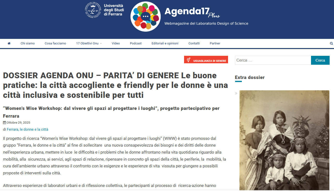 Il progetto di ricerca “Women’s Wise Workshop: dal vivere gli spazi al progettare i luoghi” (WWW) è stato promosso dal gruppo “Ferrara, le donne e la città” al fine di sollecitare una nuova consapevolezza dei bisogni e dei diritti delle donne nell’esperienza urbana, mettere in luce le difficoltà e i problemi che le donne affrontano nella vita quotidiana riguardo alla mobilità, alla sicurezza, ai servizi, agli spazi di relazione, ripensare in concreto gli spazi della città, le periferie, la mobilità, la cura dell’ambiente urbano attraverso il confronto con le esigenze e le esperienze di vita vissuta per giungere a possibili proposte di interventi sulla città.