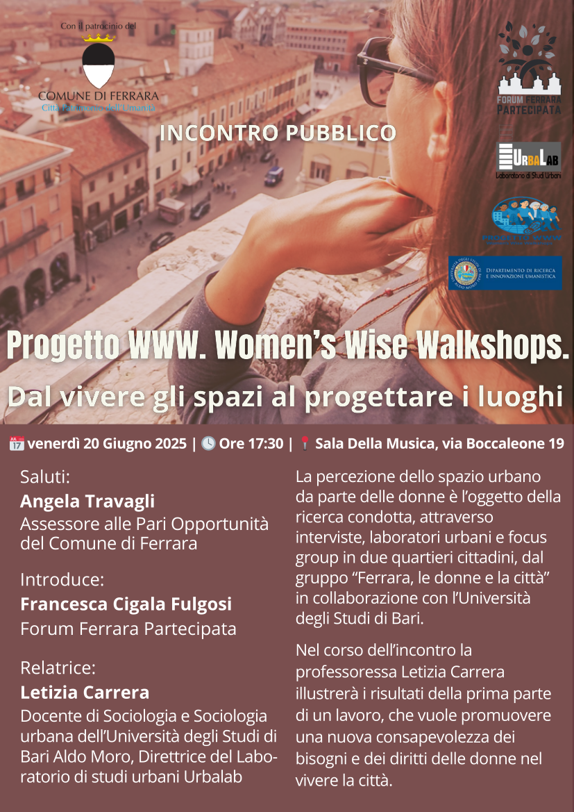 “Ferrara, le donne e la città”: INCONTRO PUBBLICO DAL VIVERE GLI SPAZI AL PROGETTARE I LUOGHI PROGETTO WWW. WOMEN’S WISE WALKSHOPS