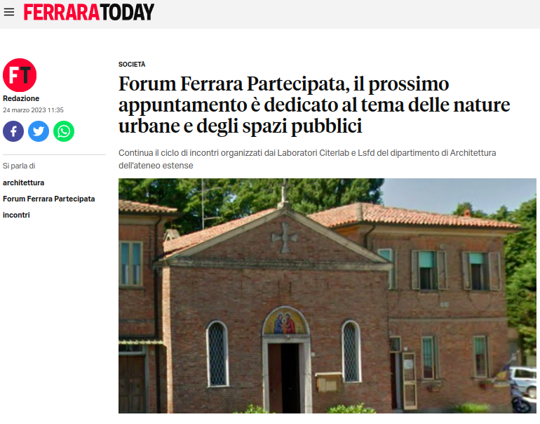 Prosegue il ciclo di incontri pubblici organizzati dal Laboratorio di ricerca Citerlab e dal Laboratorio didattico Lsfd del dipartimento di Architettura dell’Università di Ferrara, insieme al Forum Ferrara Partecipata. Appuntamenti che si prefiggono di trattare temi generali e rilevanti per il futuro delle città, legati sia all’Agenda 2030 dell’Onu (Obiettivo 11) che a numerose esperienze in corso di svolgimento anche futuro dall’Italia. Al centro degli incontri, argomenti come la rigenerazione e il consumo di suolo, la natura, il verde urbano e gli spazi pubblici, la mobilità, il diritto alla casa, la salute urbana, la partecipazione dei cittadini. Temi destinati a essere affrontati da ricercatori di diversi atenei e da esperti del settore.