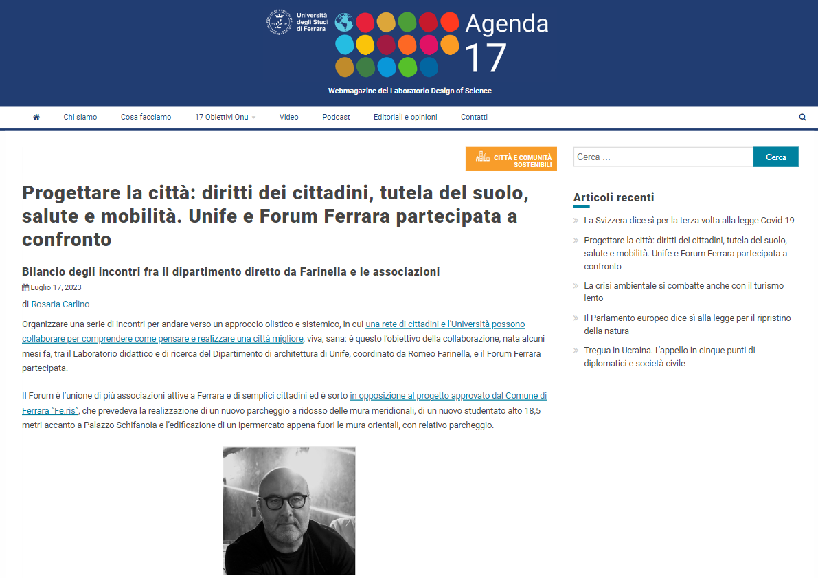 Insieme all’Università di Ferrara il Forum ha già organizzato un ciclo di incontri pubblici (“Incontri sulla città”) rivolti alla cittadinanza per l’approfondimento di tematiche relative alla qualità del vivere e dell’abitare in città, preliminari all’elaborazione di proposte e visioni per la Ferrara di domani.